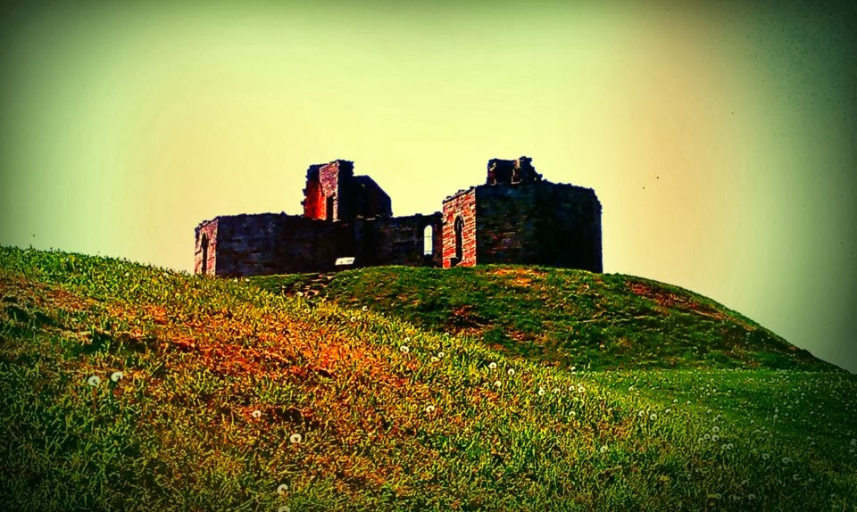 May, 2013, Trevor's shot of a Stafford Castle under a blue, restless sky and with hints of purple in a green grass.